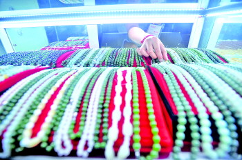 |  | 柜台内摆放着各种各样的珠宝,等待市民选购。 本报记者 任小杰 摄
