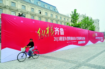 | 19日下午,2013明星车型跨越山东大型巡展(东营站)的展览场地布置完成,等待购车者的光临。 本报记者 任小杰 摄 |