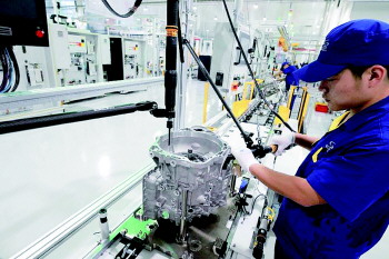 23日,在潍坊市高新区,工作人员在生产线上组装8AT自动变速器。日前,由民营企业盛瑞传动股份有限公司研发的汽车用前置前驱8挡自动变速器(8AT)在潍坊高新区顺利进入小批量生产阶段,标志着前置前驱8挡自动变速器已具备国产自主装配能力。据了解,盛瑞8AT变速器采用4个自由度行星变速机构,利用三个行星排、三对常啮合齿轮、5个换挡元件布置在两根轴系上,实现了8个前进挡和1个倒挡。