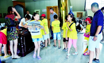 | 早上7点半左右,在本报社一楼大厅内小选手们正在排队领取报纸。 本报记者 何纯 摄 |