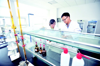 | 黄河三角洲城市水系与湿地研究所的工作人员正在对土壤样本进行检测。 |