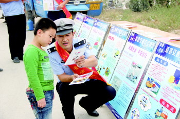 7日,东营交警直属二大队三中队民警到牛庄镇集贸市场,开展以“遵守交通法规、安全文明出行”为主题的交通安全集中宣传教育活动。民警通过摆放宣传展板、现场宣传教育等多种方式对集贸市场的摊主及前来赶集的群众进行交通安全宣传。 本报记者 顾松 通讯员 曲庆林 摄影报道