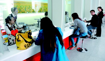 | 东营一银行大堂内,市民在柜台前办理业务。 本报记者 段学虎 摄 |
