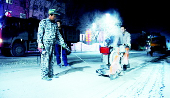 | ◥12日万8时许,施工人员在运河路上连夜赶工。 本报记者 段学虎 摄 |