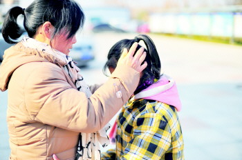 | 文文的头发被大风刮乱,母亲帮她整理。 本报记者 任小杰 摄 |