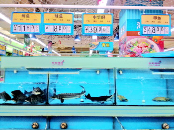 | 超市水产区,销售牌上标有“中华鲟”字样。 本报记者 周晋 摄 |