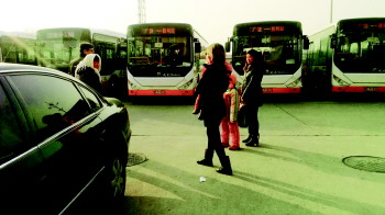 | 广饶到胜利站部分公交车暂时停运,停在胜利站内。 本报记者 张园园 摄 |