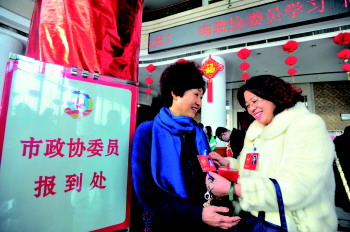 | ◤8日下午,政协委员们陆续到达报到地点,准备参加政协第七届东营市委员会第三次会议。 本报记者 任小杰 摄 |