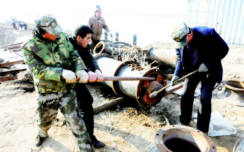 垦利县十八户引黄闸因为无法自流取水,人们只能修理水泵,准备抽水。