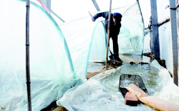 盐窝镇南西滩村的菜农抢灌刚种上蔬菜的大棚。