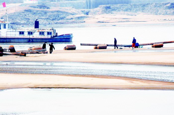12日,记者来到黄河东营段的最上游麻湾段,在黄河右岸,记者看到早已经重新通车的浮桥已经变成了“地上桥”,长长的浮桥有一半浮箱是搁在河床的沙土上,河水已经被露出水面的沙洲分成了两条小河。整个百米宽的河床,水面只有约一半的面积。新露出水面的沙洲上还能看到有人手持简易渔网捕鱼。