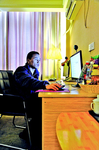 在宾馆式网吧内,一位顾客正在使用房间内的电脑上网。