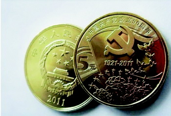 中国共产党成立90周年普通纪念币30元/枚 中国共产党成立90周年纪念币是中国人民银行于2011年6月16日发行的,发行数量为6000万枚,面额为5元,直径为30毫米,材质为黄铜合金,与现行流通人民币职能相同。制作十分精美,值得收藏。