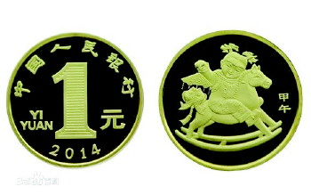 马年纪念币 30元/枚 50元/2枚 正面刊“中国人民银行”、“1元”、汉语拼音“YIYUAN”及年号“2014”;背面图案为一个手持寓意“吉庆有余”挂件的小女孩骑在木马上,其右方刊“甲午”字样。该币面额1元,直径25毫米,材质为黄铜合金。