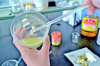 用胶头滴管吸取3滴花生油滴在口香糖上。用手揉捏蘸着口香糖的试管毛。不到两分钟,试管毛上的口香糖被全部清理干净。