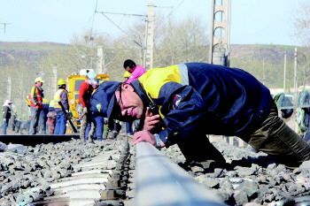 工作人员霍刚正在对捣固过的铁轨线路进行水平校准。
