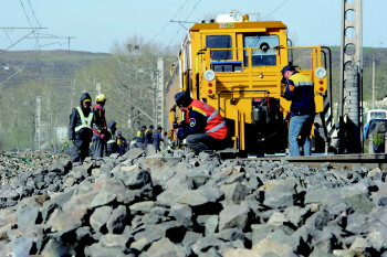▼工作人员正在京包铁路(卓资山至葫芦段)进行线路捣固作业。