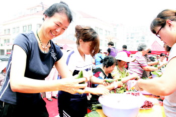 |  | ▲老师正在台下指挥着小朋友做动作。 见习记者 刘海滨 摄 |  | ▲社区居民高高兴兴地参加包粽子比赛。 本报记者 郑美芹 摄 |