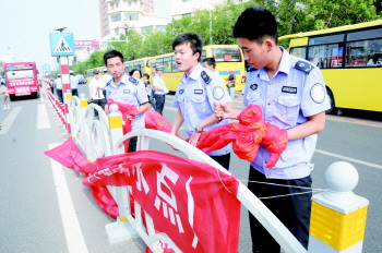 | 去年高考期间,城管执法部门在考点附近清除乱挂的条幅。(资料片) 本报记者 段学虎 摄 |