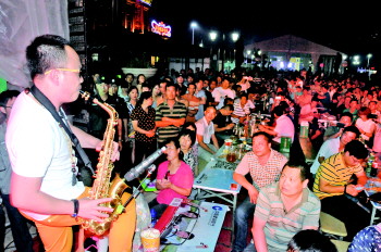 本报7月8日讯(见习记者 孙川) 激昂的旋律、高亢的歌声配合着啤酒美食,让今晚的沂州路步行街再次成为欢乐的海洋。歌手恰到好处的情绪调动和观众热切配合让现场气氛达到爆棚的顶点。