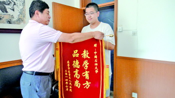 14日,韩先生为了表示对刘璟垚的感谢,拿着早已做好的锦旗来到了石油大学。见到刘璟垚后,韩先生激动地握住了他的手,还不断说“小伙子,你帮了我大忙啊!真是谢谢你!”记者发现,刘璟垚是个腼腆的小伙子,面对韩先生的感谢,他一直都在重复一句话,“这是我应该做的,没什么的。”随后,韩先生还拿出1000元想让刘璟垚收下以示感谢,但刘璟垚坚持拒绝接受。