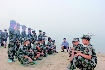 下午四点,刘公岛的天空突然阴沉下来,海上升起一层薄薄的白雾,军营也笼罩了一层清爽的气息。“立正!稍息!跨立!”训练就在凉爽潮湿的海风中开始了。虽然已来刘公岛3天了,但真正的训练时间只有1天,年纪小的几个小记者还是记不清要领。