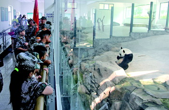 大家在刘公岛国家森林公园观看大熊猫。