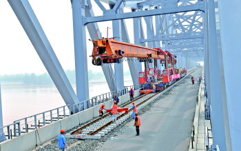 7日,正在黄河大桥进行铺轨任务的德大铁路,距离全线合拢仅剩下7公里。 本报记者 杨玉龙 摄