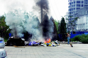 2014年7月23日下午4点左右,百货大楼黄河路店前的广场上,浓烟滚滚,从远处一看还以为是发生了火灾,走近一看原来是在焚烧垃圾。“烟太大了,还有异味,雨后这么凉快的天都不敢开窗户。”在东邻金领国际大厦13楼上班的胡女士说,“该好好管管了,烧了不是一次两次了”。 本报记者 尹雪川 摄影报道