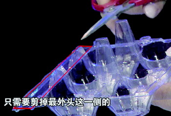 1.盒盖顶部是平的,只有底部有鸡蛋形状的凹槽,所以要把盒盖剪掉不用。接下来要把盒底中间和其中一边的凸起都剪掉。先剪掉中间两个高的凸起,然后将盒边上这些矮的凸起也剪掉,半个包装盒就变成了上面有许多洞。