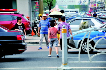 马路本应服务于机动车,让车辆能够更加顺利地穿梭于城市之间。但是仍有一些市民为了走近路,不愿意走更为安全的人行横道,而是从马路中间穿行。为了躲避这些随意穿行的行人,一些机动车也不得不减慢速度,以免发生碰撞。图为27日济南路上,一些行人从断开的防护带中间穿越到马路对面。 本报记者 刘海滨 摄影报道
