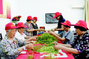 近日,胜北社区胜荣党员服务社的志愿者在未喷洒农药的槐树树枝上取下槐米,经过筛选、晒干、炒至、包装等工序后,制作茶叶成品放到党员服务社内,让退休职工免费品尝。