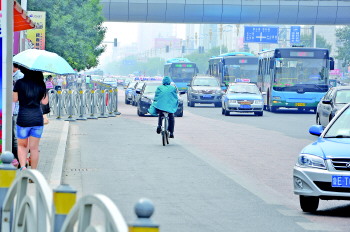 11日,在西城振华商厦前,一位市民没有在规定的道路上行驶,而是在机动车道上慢悠悠地逆向骑行,全然没有考虑到交通安全问题。而在机动车道上,车辆都在井然有序地行驶着,一些车辆注意到有人逆行,便减速并且变道远离自行车。 本报记者 刘海滨 摄影报道