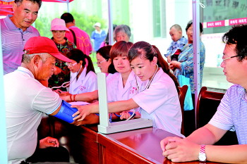 民政社工医疗服务队为社区居民免费量血压。