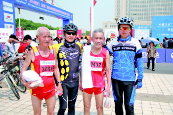 人们争相与高龄马拉松参赛者合影。 (资料片) 本报记者 杨玉龙 摄