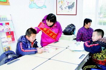 扈韵芬说,自从创城以来,她就做文明引导员,已经3年了。每天在小区中巡逻,捡垃圾,做文明引导……慢慢地她发现了,学校放学后,总有些孩子出于各种原因迟迟不回家。志愿者们向社区反映了这种情况。在社区的申请下,由街道出资在小区东门处新建了3间屋子,设立了“助学服务岗”。“听到这个消息后,我们这些志愿者就自发报名,按时到门岗处‘上班’了,其实都是义务劳动。”刘树荣笑着说。记者看到了屋内墙上张贴着的值班表。下午4点10分,宋国谦按时到门岗处“上班”了,这天共有3位志愿者值班。