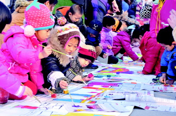 ◥小朋友们现场画长卷,表达对东营这座城市的热爱。
