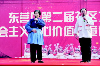 有的小朋友们在舞台上开心地表演节目《快乐的小羊》,有的小朋友在舞台下创作十米长卷,描绘东营这座城市的地标建筑,展望未来的美好生活。