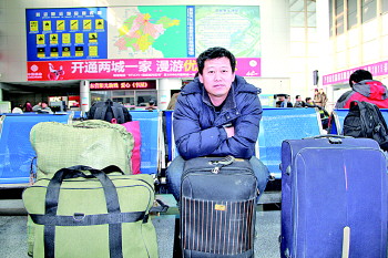 在候车厅中,来自东北黑龙江省海林市柴河镇的王印贵,将头深深埋在两旁的行李中。王印贵告诉记者,他到东营已有一年时间,这是他一年来第一次回东北老家。