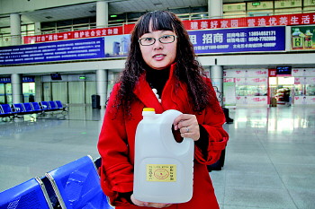 在候车厅里,还有很多前来送别亲友的人,彭琛琛就是其中的一个。她拖着一个行李箱,手提一桶散酒,“马场的酒是咱东营的特色,想让我爸也尝尝!”