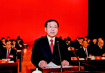 胜利油田七届三次职工代表大会上,管理局局长、油田分公司总经理孙焕泉作工作报告。