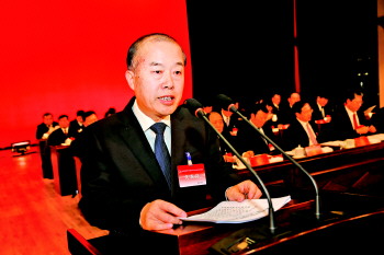 胜利油田七届三次职工代表大会上,管理局党委书记席秀海发表讲话。