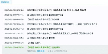 从“早早”的快件物流信息上可以看到,卖家在1月23日20点52分将她的货物发出,1月27日9点55分快件到达东营,且随后的一条物流信息显示,东营的派件员转同行正在派件。