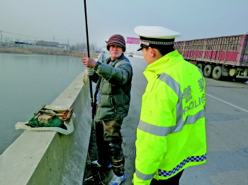 近日,随着天气逐渐转暖,支脉河河面解冻,引来许多钓鱼者,站在新海路大桥上垂钓。该路段车流大,且货车较多,此行为造成诸多安全隐患,且影响了正常的交通秩序。图为5日,广饶交警三中队民警对垂钓者进行劝离。 本报记者 王超 通讯员 张景海 张建文 摄影报道