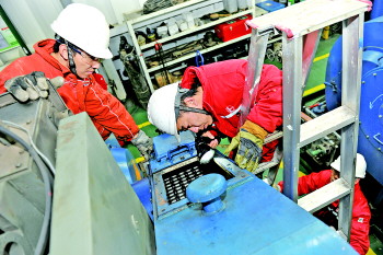 2月6日,海洋钻井新胜利一号钻井平台的员工打开泥浆泵链条箱后,仔细检查链条磨损情况。据了解,今年以来,海洋钻井公司积极转变设备管理思路,利用平台综合数据中心,每天精细分析平台每一台设备运转情况。与此同时,该公司还结合平台设备参数性能等内容强化设备的预防性保养、检查、修理,扭紧设备管理程序链条,做到不让一台设备带病运转,不让一台设备停待影响钻井生产。 本报记者 顾松 通讯员 王为 摄影报道