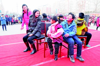 与绑腿跑游戏中清一色的孩子参与不同,同样考验默契的萝卜蹲游戏则是大人孩子一同参与,有的更是母子、父子一同上阵,随着主持人不断加快语速,不断有“萝卜”淘汰,但也有不少组合“笑”到最后,拿到了奖品。“上台不只是为了赢,也是为了体验一下热闹的气氛,这感觉就像新年提前到来了。”萝卜蹲游戏参与者刘海霞说。