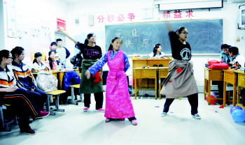 索朗普赤(中)跟同学们一起跳舞。 本报记者 段学虎 摄