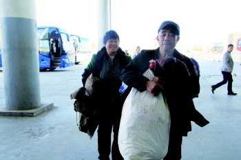 3日中午,在东营汽车总站出站口,一对农民工夫妇刚下客车。
