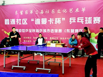 3月1日上午,东营区第二届社区文化艺术节鑫源社区“迪曼卡杯”乒乓球赛在正大乒乓球馆举行。来自鑫源社区和东西城、利津县的70余名乒乓球爱好者参加了此次比赛。鑫源社区党总支书记、工作站站长朱炳伟说:“大家欢聚一堂,切磋球技,既响应了广大居民的需求,也增进了社区和居民之间的情感。”