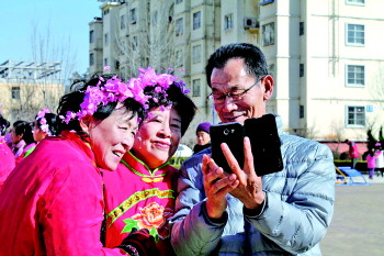 孤岛社区西苑党员服务社的非在职老党员们在西苑小区进行社火表演前的带妆彩排,让居民拍手叫好。